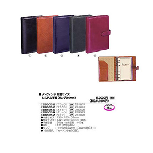 ガイドプロテクター・パーソナルプロフィール(1枚)・ブックマーク(1枚)・マンスリースケジュール(20枚)・ウィークリースケジュール(20枚)・ノート(20枚)・チェックリスト(10枚)・アドレス(10枚)・インデックス(6枚)・カードホルダー(1枚)・ファスナーポケット(1枚)